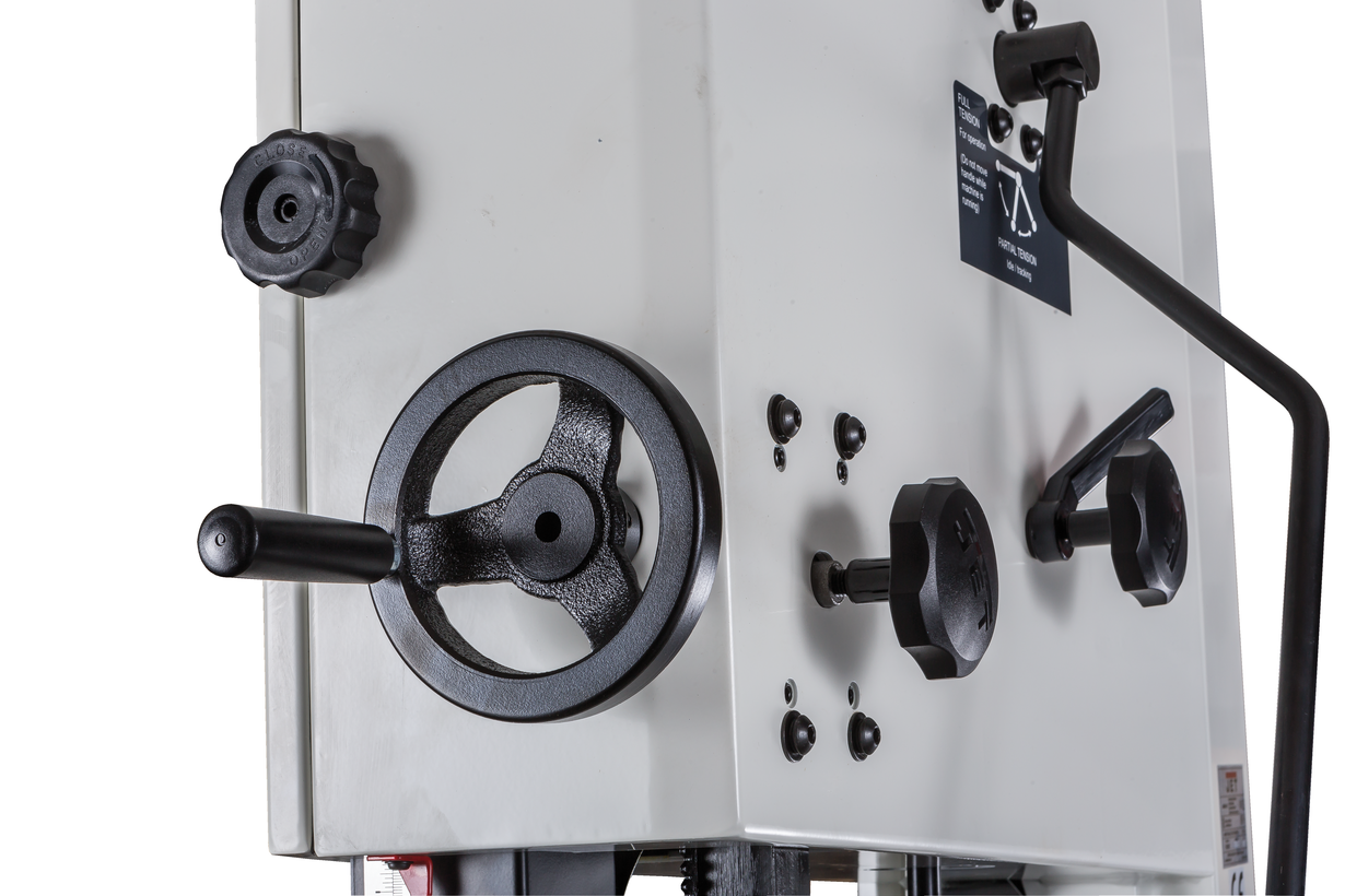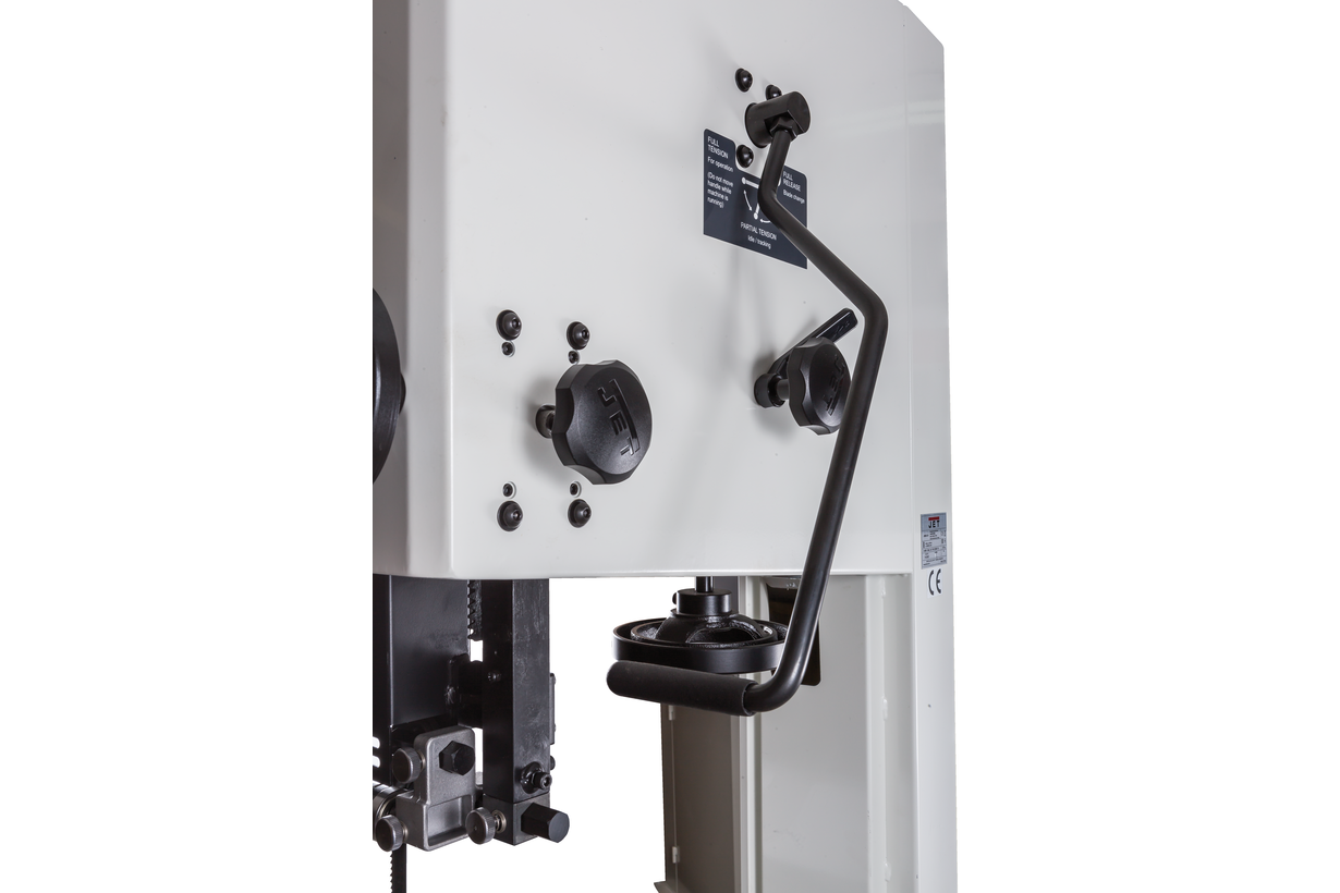 Механизм натяжения и центрирования ленты включает в себя две группы трехроликовых направляющих на шарикоподшипниках, стрелочный индикатор уровня натяжения, регулирующие маховики, два смотровых окошка и рычаг быстрого натяжения-ослабления. Он не совсем обычен, поскольку имеет не два, а три фиксированных положения: рабочее (плотно натянуто), для хранения (лента ослаблена, но держится на шкивах) и сервисное (для замены полотна). Чтобы улучшить плавность работы, использованы чугунные шкивы с массивным телом, а не в виде спицованных колес, как раньше.