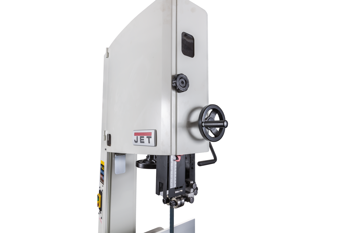 Jet JWBS-18 – новая ленточная пила для профессионального применения. Ее основное преимущество на фоне аналогов прошлых поколений – увеличенная высота распиловки. Этот параметр очень важен для тех, кому нужен универсальный станок, способный взять на себя функции делительного. К подобным работам приспособлен и параллельный упор: направляющий профиль можно установить вертикально на боковую грань так, чтобы надежно фиксировать плоские заготовки при их роспуске на тонкие пластины. В целом конструкция бокового упора очень хорошо проработана и соответствует самым строгим требованиям: профиль жесткий и прочный, закреплен на массивном чугунном кронштейне, который перемещается по цилиндрической направляющей. Предусмотрена грубая (вручную) и точная (микрометрическим винтом) установка.