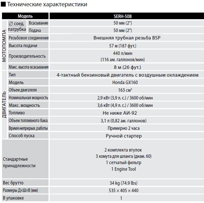 Высоконапорная, пожарная бензиновая мотопомпа. Тушение пожаров, перекачка воды на дальние растояние, полив. Мощность 3.9 лс, Производительность 26.4 куб м/час, напор 57 м, двигатель Honda GX160, D вх/вых 50 мм, размер частиц 6 мм, бак 3.1 л.