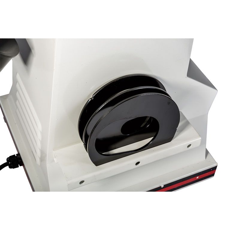 Мощный асинхронный двигатель рассчитан на продолжительную эксплуатацию, массивный корпус на резиновых опорах и тяжёлый чугунный стол хорошо поглощают вибрации. Есть механизм наклона стола на угол до 45°, чтобы шлифовать под углом.
