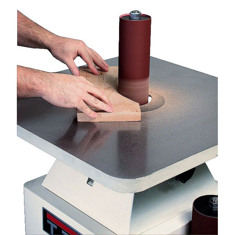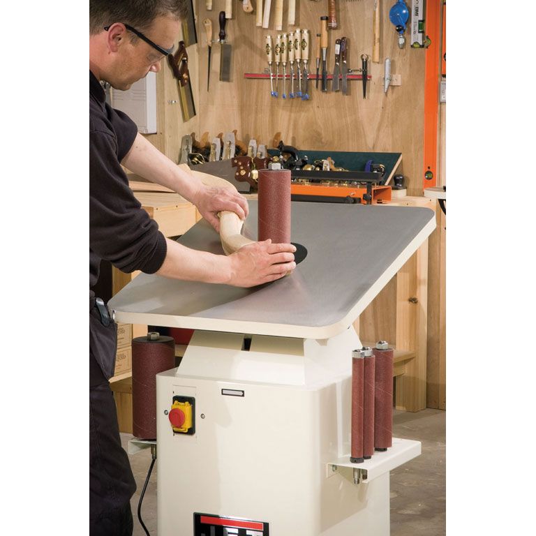 Стандартная комплектация включает в себя 10 шлифовальных шпинделей с диаметром от 6 до 100 миллиметров, а также кольцевые вставки в рабочий стол с круглым и овальным отверстием (для работы в наклонном положении стола). Расходный материал – абразивные гильзы – предлагаются со склада Jet в широком ассортименте.