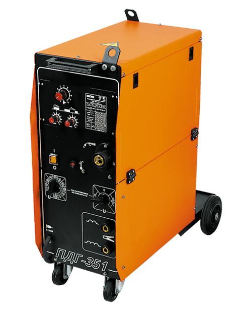 Сварочный полуавтомат ПДГ-351 однокорпусной (с подающим механизмом) для сварки малоуглеродистых, низколегированных сталей в защитных газах на постоянном токе. Конструкция полуавтомата выполнена в одном корпусе и состоит из источника питания и встроенного подающего механизма.
